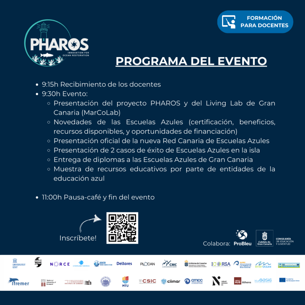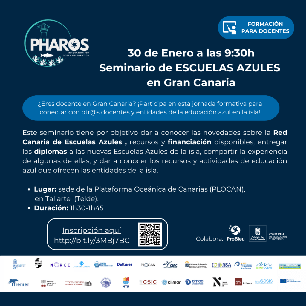 El seminario de Escuelas Azules es solo una de las actividades del megaevento PHAROS, que se prolongará durante toda la semana del 28 al 31 de enero de 2026, con sesiones adicionales programadas para el jueves por la tarde (un musical a cargo de la Escuela Azul “CEIP Maestro Félix Santana” en el Museo Elder, y el sábado con un bioblitz para censar biodiversidad costera paseando por la costa).
